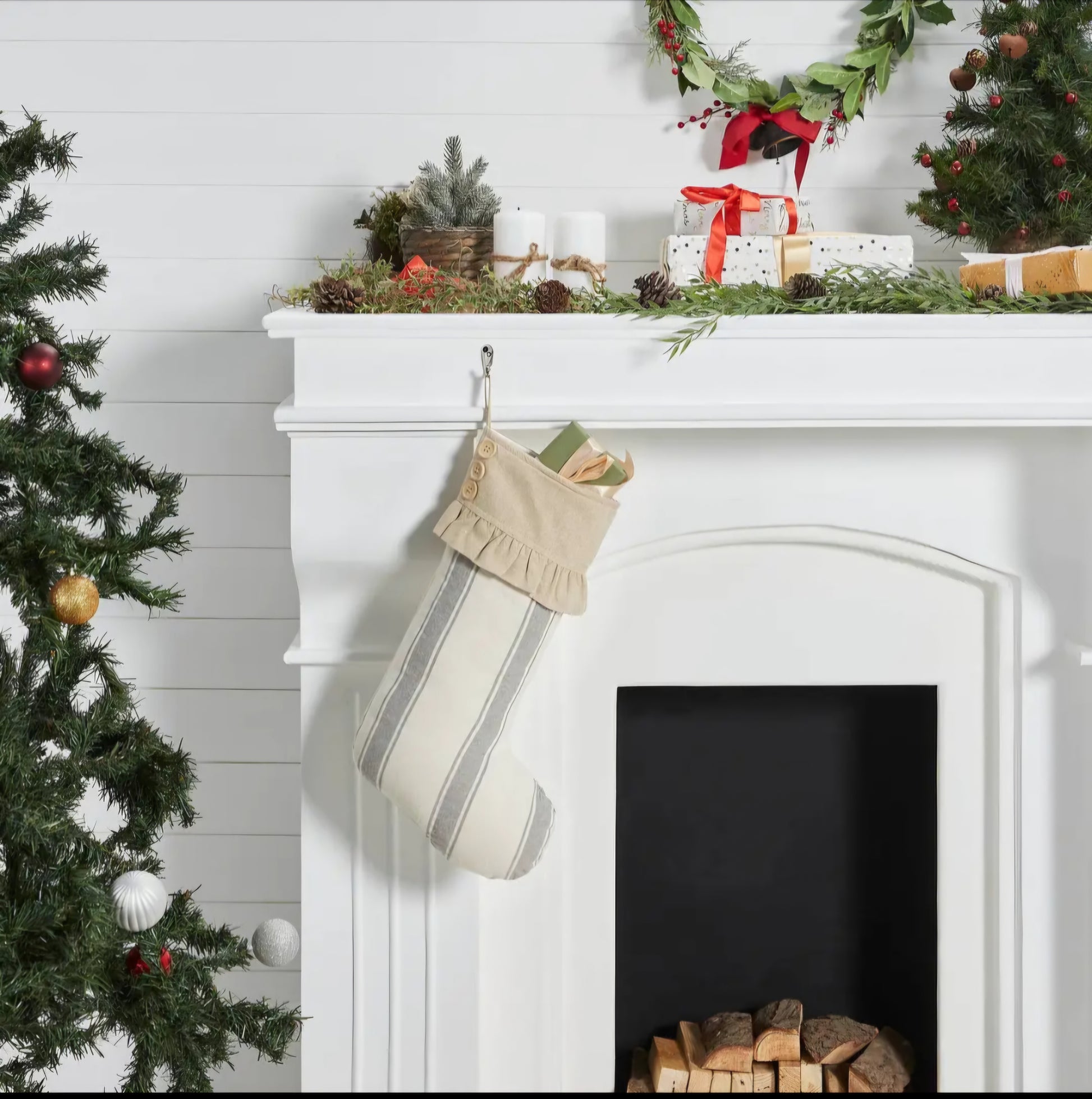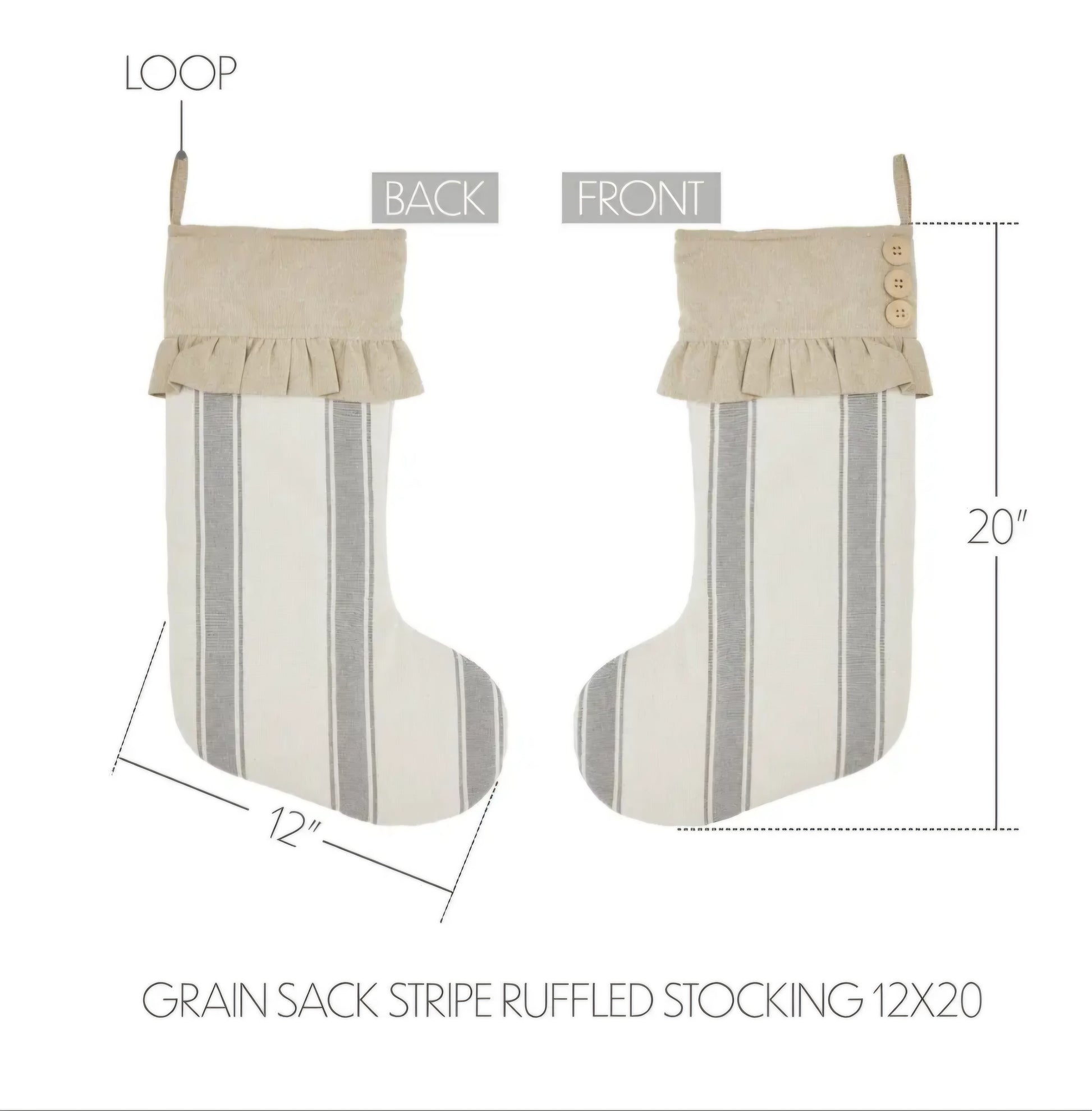 Simplicity and traditional style add an elegant accent to your Christmas decor. This features soft tones of nickel grey, cream, and deep tan. This stocking coordinates with any Farmhouse style or blends with a Vintage style.